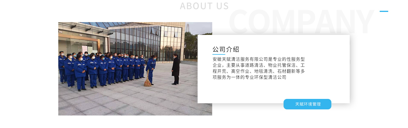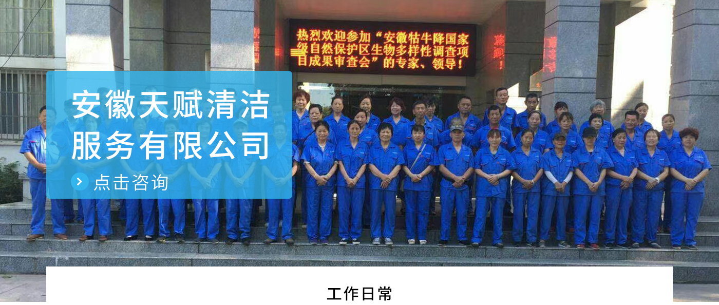 安徽天賦清潔服務(wù)有限公司是的服務(wù)型企業(yè),主要從事道路清潔、物業(yè)托管保潔、工程開荒、高空作業(yè)、地毯清洗、石材翻新等多項(xiàng)服務(wù)為一體的環(huán)保型清潔公司。公司管理機(jī)制完善,清潔作業(yè)經(jīng)驗(yàn)豐富,擁有技術(shù)力量,嚴(yán)格實(shí)行崗前培訓(xùn)—崗中督查—上崗在培訓(xùn)的員工管理措施,憑著優(yōu)良的清潔質(zhì)量和嚴(yán)格的督查管理,為眾多企事業(yè)單位、醫(yī)院、酒店、廠區(qū)商場(chǎng)、物業(yè)、道路、學(xué)校、公園等提供后勤清潔服務(wù)。在業(yè)內(nèi)擁有良好的口碑。工作人員,服務(wù)態(tài)度優(yōu),竭力為客戶提供好的保潔服務(wù)。安徽天賦清潔服務(wù)有限公司:致力于長期合作關(guān)系,提高服務(wù)質(zhì)量,提供高標(biāo)準(zhǔn)的清潔服務(wù)。公司的經(jīng)營理念:為營造一個(gè)更清潔、亮麗的生活和工作環(huán)境而努力!“誠信”是公司成功保證。“客戶至上,信譽(yù)為首”是公司宗旨。高標(biāo)準(zhǔn)提供服務(wù),維護(hù)客戶利益、形象,是我始終不渝的目標(biāo)。