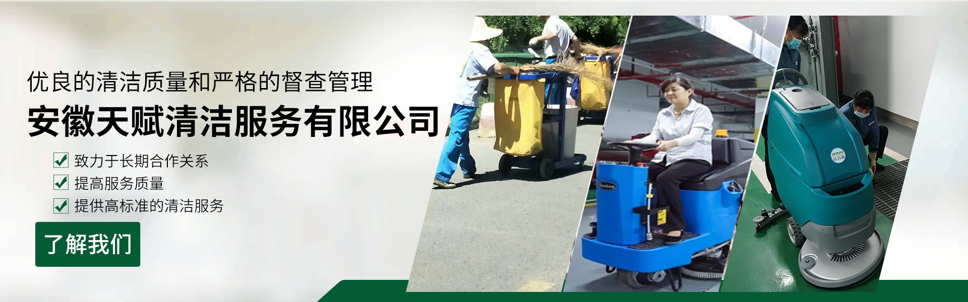 安徽天賦清潔服務(wù)有限公司是的服務(wù)型企業(yè),主要從事道路清潔、物業(yè)托管保潔、工程開荒、高空作業(yè)、地毯清洗、石材翻新等多項(xiàng)服務(wù)為一體的環(huán)保型清潔公司。公司管理機(jī)制完善,清潔作業(yè)經(jīng)驗(yàn)豐富,擁有技術(shù)力量,嚴(yán)格實(shí)行崗前培訓(xùn)—崗中督查—上崗在培訓(xùn)的員工管理措施,憑著優(yōu)良的清潔質(zhì)量和嚴(yán)格的督查管理,為眾多企事業(yè)單位、醫(yī)院、酒店、廠區(qū)商場(chǎng)、物業(yè)、道路、學(xué)校、公園等提供后勤清潔服務(wù)。在業(yè)內(nèi)擁有良好的口碑。工作人員,服務(wù)態(tài)度優(yōu),竭力為客戶提供好的保潔服務(wù)。安徽天賦清潔服務(wù)有限公司:致力于長期合作關(guān)系,提高服務(wù)質(zhì)量,提供高標(biāo)準(zhǔn)的清潔服務(wù)。公司的經(jīng)營理念:為營造一個(gè)更清潔、亮麗的生活和工作環(huán)境而努力!“誠信”是公司成功保證。“客戶至上,信譽(yù)為首”是公司宗旨。高標(biāo)準(zhǔn)提供服務(wù),維護(hù)客戶利益、形象,是我始終不渝的目標(biāo)。